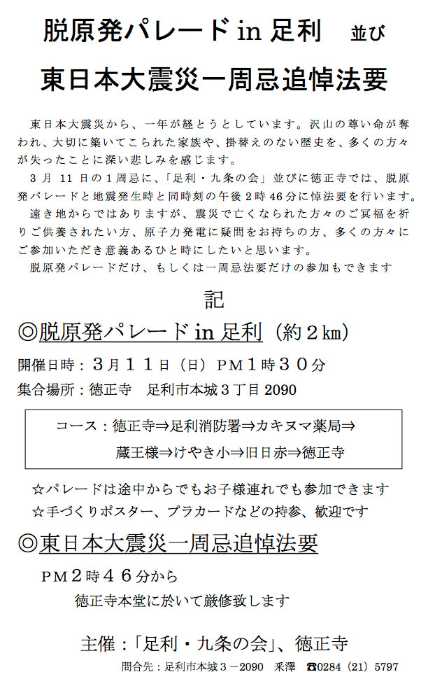 足利からも脱原発・再稼働反対の声を挙げながら一緒に歩きましょう!