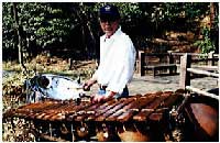 バラフォンは西アフリカ(セネガル)一帯の楽器で木琴の原型です。音階のついた木片にそれぞれ共鳴器のひょうたんが付いています。ひょうたんに空けられた1〜2箇所の穴をクモの巣で塞ぐことで、木琴と鼓を合わせたよな深みのある音を出すのが特色。