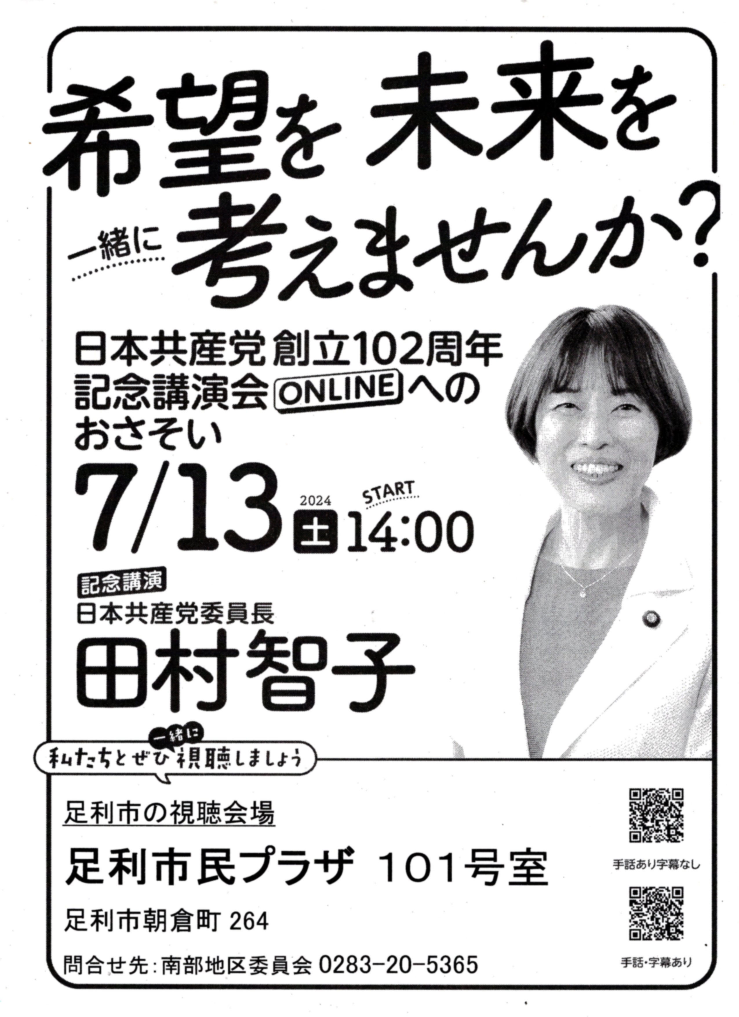 お知らせ 日本共産党創立102年記念講演会ONLINE 「希望を 未来を 一緒に考えませんか?」 2024 7/13 (土) 14:00 start 足利市の視聴会場:足利市民プラザ101号室 足利市朝倉町264 主催: 南部地区委員会 連絡先 0283-20-5365