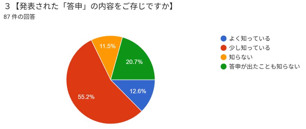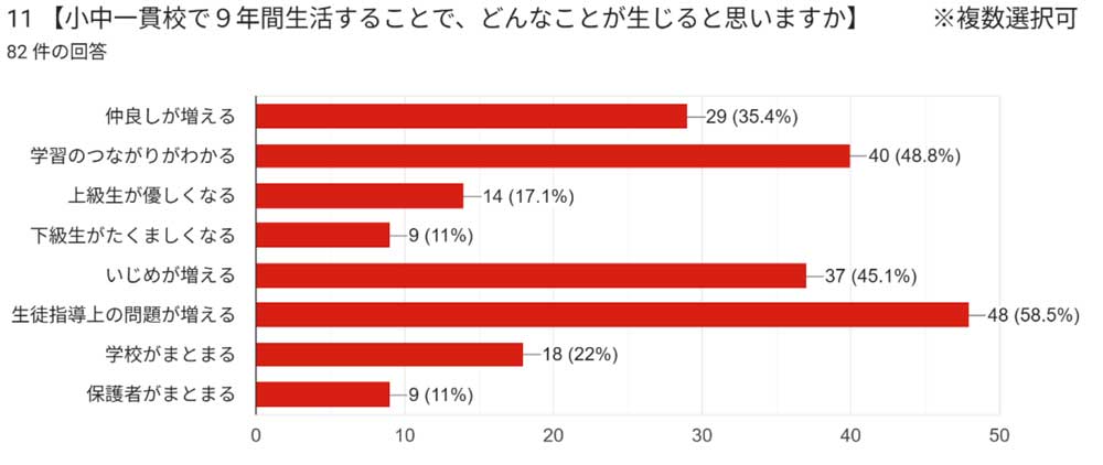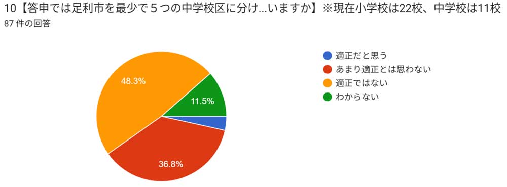 2025.07.08での集計 現在継続中 このアンケートは、足利市教育委員会が公表した「足利市立小・中学校の学校教育環境の充実に関する答申」の内容を知った私たち(「足利の学校教育を考える会」)が、足利市の考える学校再編(統廃合)を多くの市民、とりわけ統廃合が迫る地域の市民のみなさんが、どのように受け止めておられるか理解するために行うものです。同時にお配りする資料を参考にしながらご意見をお聞かせください。 私たちは、「未来を担う子どもたちと地域の魅力(文化や産業)を生かした地域づくりのために市民や議会や市当局と話し合い、知恵と力を集めて学校教育環境を整えたい(『会発足の趣旨』から)」と考えています。いただいたご意見は、その活動のために十分に生かしたいと思いますので、ご協力をよろしくお願いいたします。 6月下旬に行う学習会の資料として集計するため、1回目の集約を6月15日までに回答して頂いた分で行う予定にしています。ご了承ください。 足利の学校教育を考える会 代表 金子武 アンケートは継続して行っています.ご協力下さい.